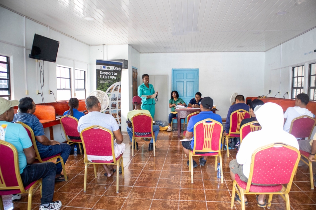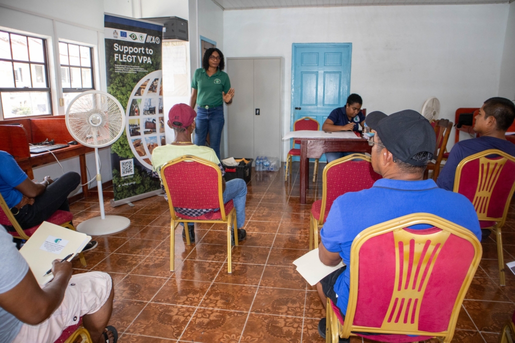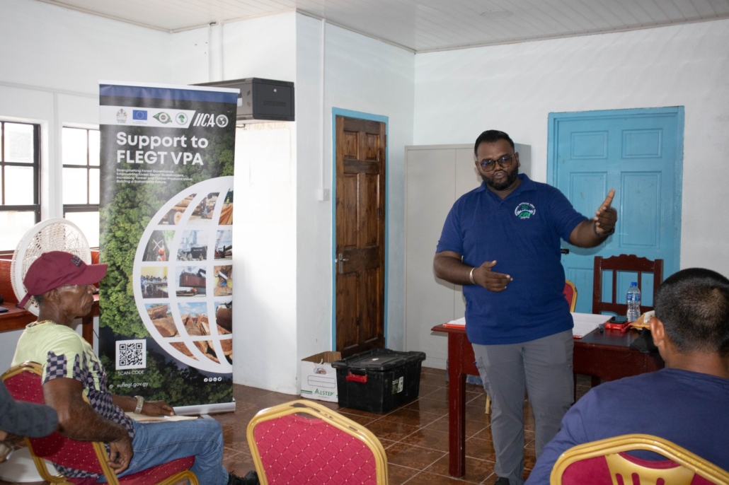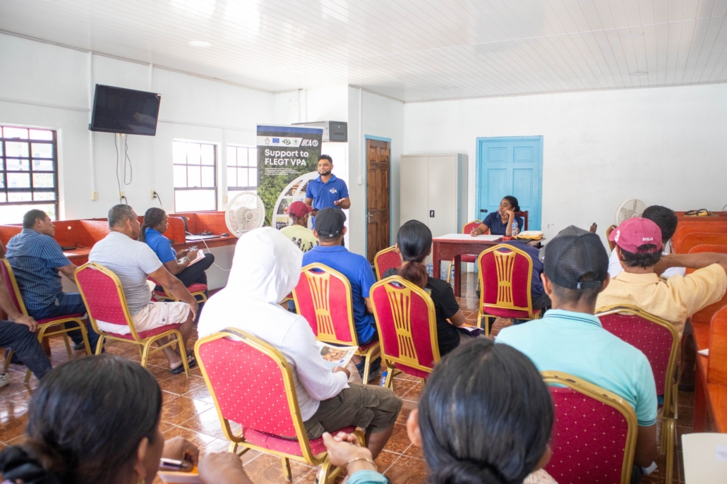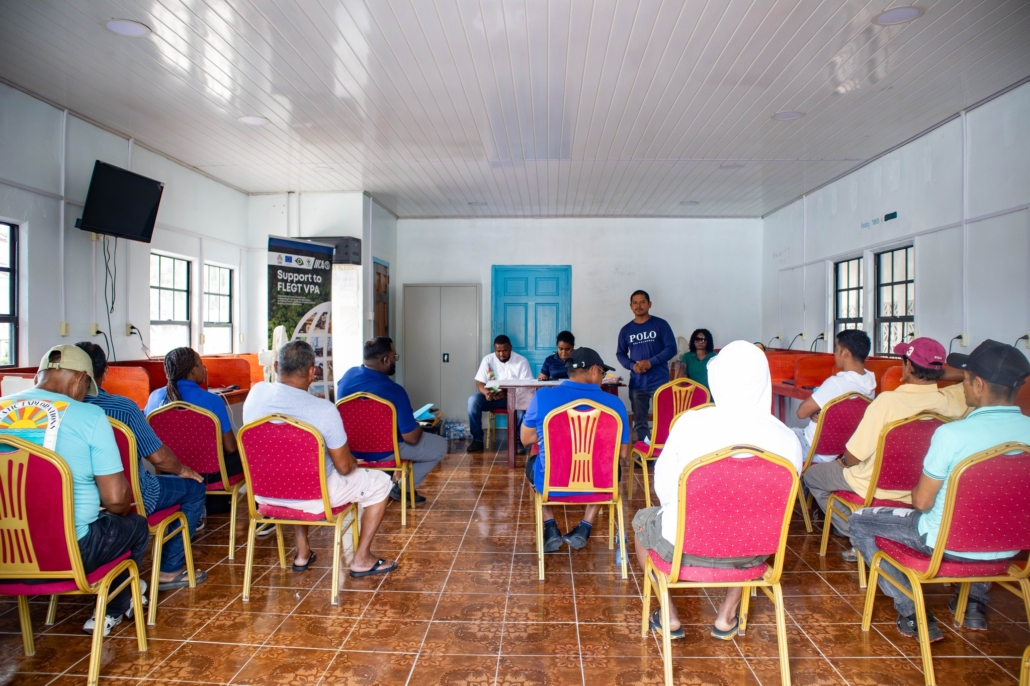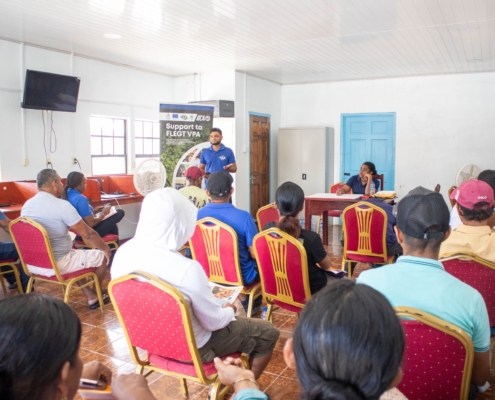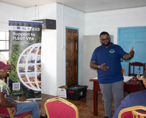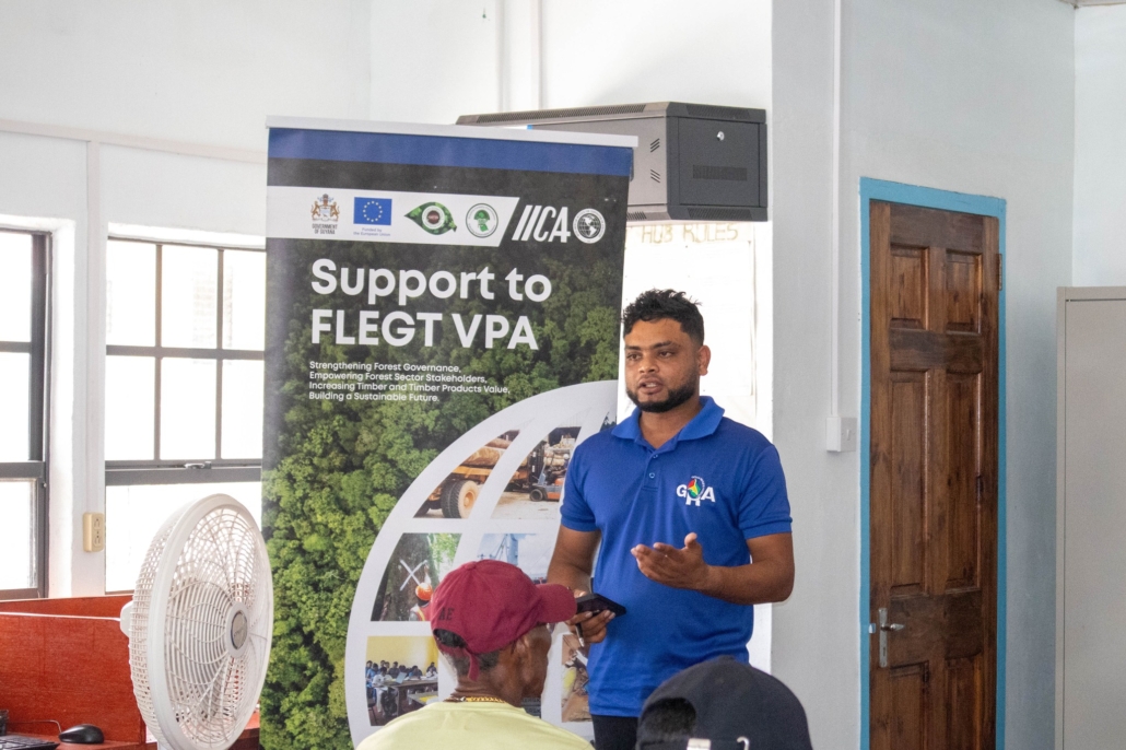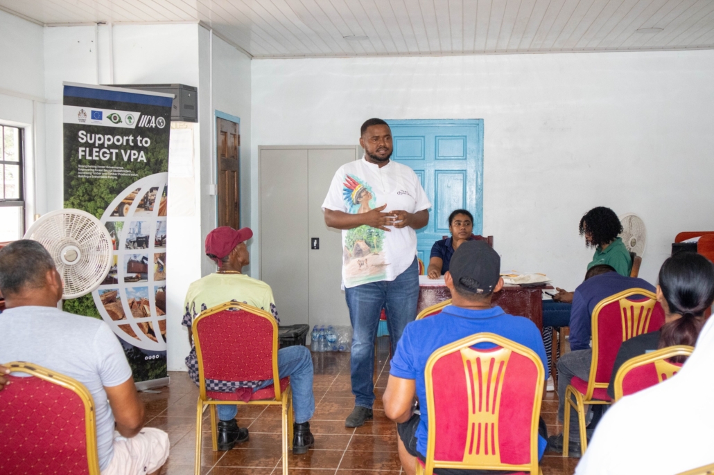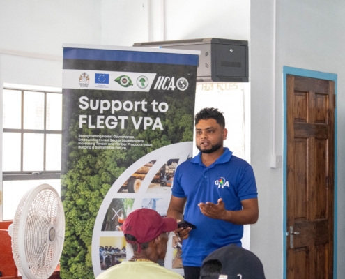 On Tuesday, April 21, the Toshao, Deputy Toshao, Village Council Members, and FSOs of Wakapao welcomed the FLEGT team from the Guyana Forestry Commission, along with representatives from the EPA – Guyana, the National Insurance Scheme – Guyana, the Ministry of Labour & Manpower Planning Guyana, the Guyana Revenue Authority, and the Ministry of Amerindian Affairs. The session is part of the EU-funded outreach under the FLEGT VPA Programme, implemented by IICA Guyana.